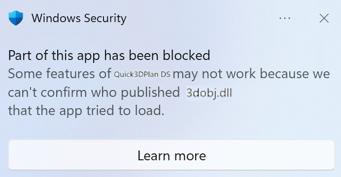 Some features of C:\Quick3DPlan DS\Q3DPDS.exe may not work because we can’t confirm who published 3dobj.dll that the app tried to load.