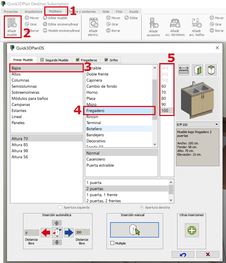 1- En primer lugar, dentro de la pestaña “Mobiliario[1], selecciona la opción “Añadir mueble[2].  En la ventana de selección de muebles, clic en “Bajos[3] -> “Fregadero[4], y selecciona el ancho del mueble [5] (en nuestro ejemplo, 100cm.) Debes tener en cuenta que el ancho del mueble debe ser superior al ancho del fregadero.  Puedes verlo en esta captura: