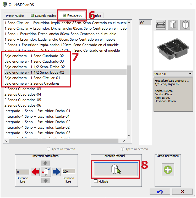 2- En las pestañas superiores, haz clic en la pestaña “Fregaderos[6] , y selecciona cualquier modelo de fregadero “Bajo encimera[7].  Por último, haz clic en “Inserción manual[8] para insertar el mueble en el diseño.  Puedes verlo en la siguiente captura: