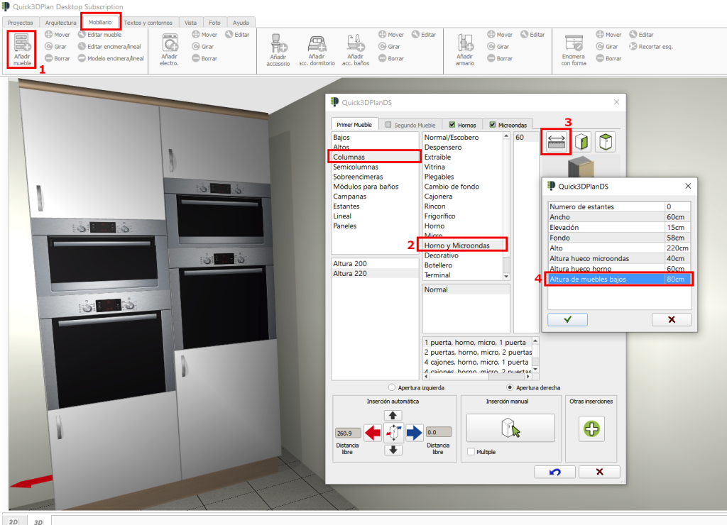 Para cambiar la altura de los electrodomésticos en los muebles ‘Columna Horno y Microondas‘, dentro de la ventana de “Añadir mueble” [1], selecciona el tipo de mueble “Columnas” -> “Horno y Microondas” [2], pulsa en el botón para “Modificar las medidas del mueble” [3], y finalmente configura la opción “Altura de muebles bajos” a 80cm (o la medida que necesites) [4]. Acepta la ventana e inserte este mueble: