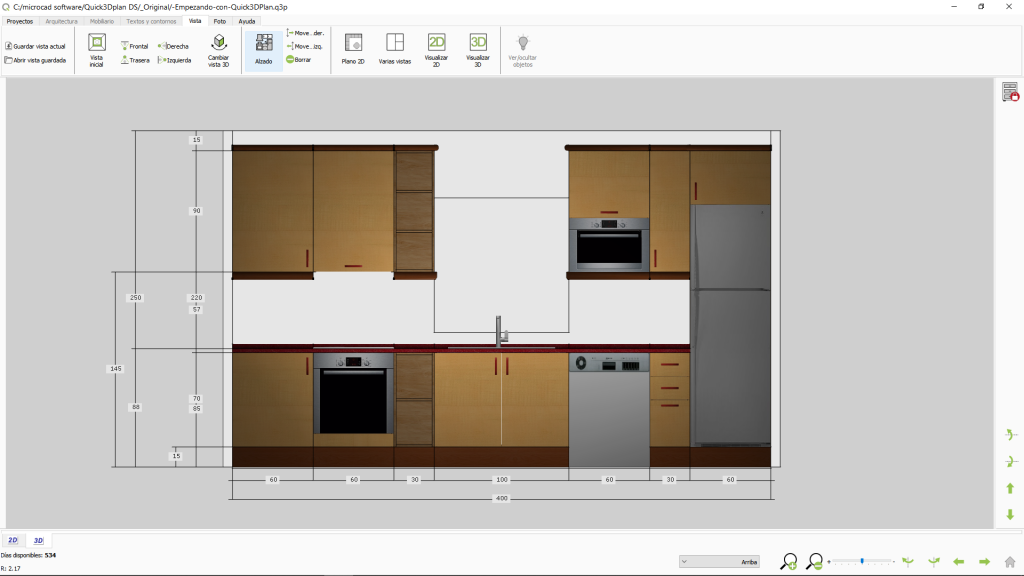 Para crear un alzado acotado de las paredes de una cocina, de forma que se puedan ver los muebles de la pared seleccionada con todas las cotas, sigue estos pasos: