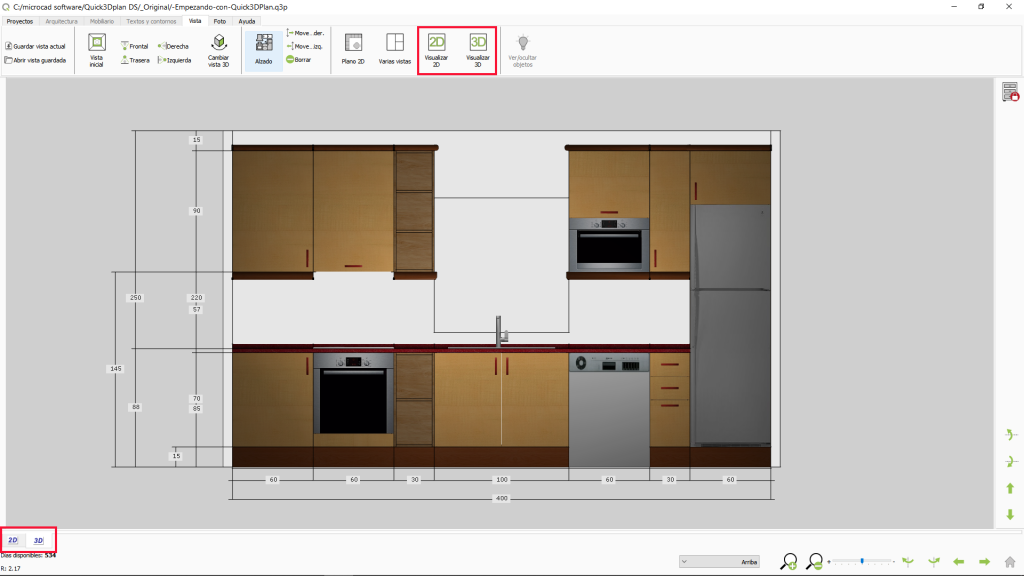 NOTA: Para ‘salir’ del alzado automático, puedes usar la pestaña ‘2D‘, o bien los botones de la barra de herramienta superior ‘Visualizar 2D‘ y ‘Visualizar 3D‘: